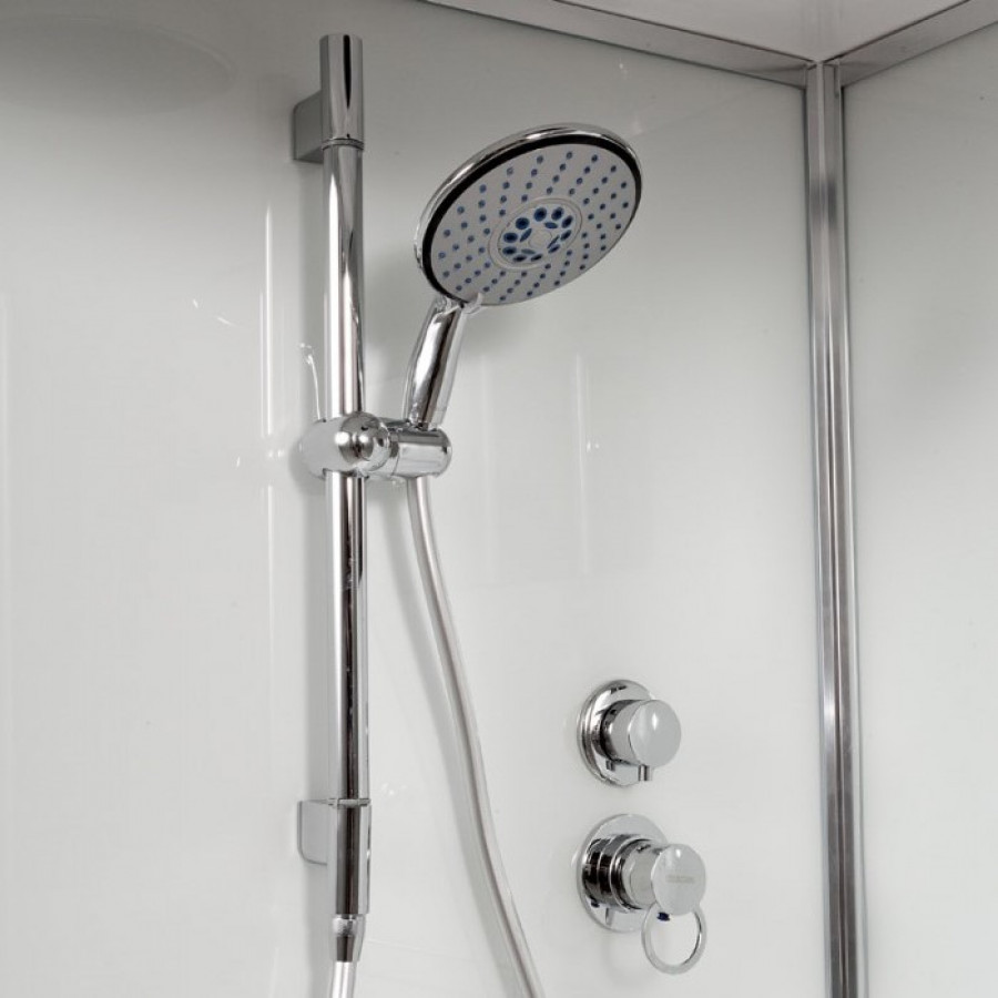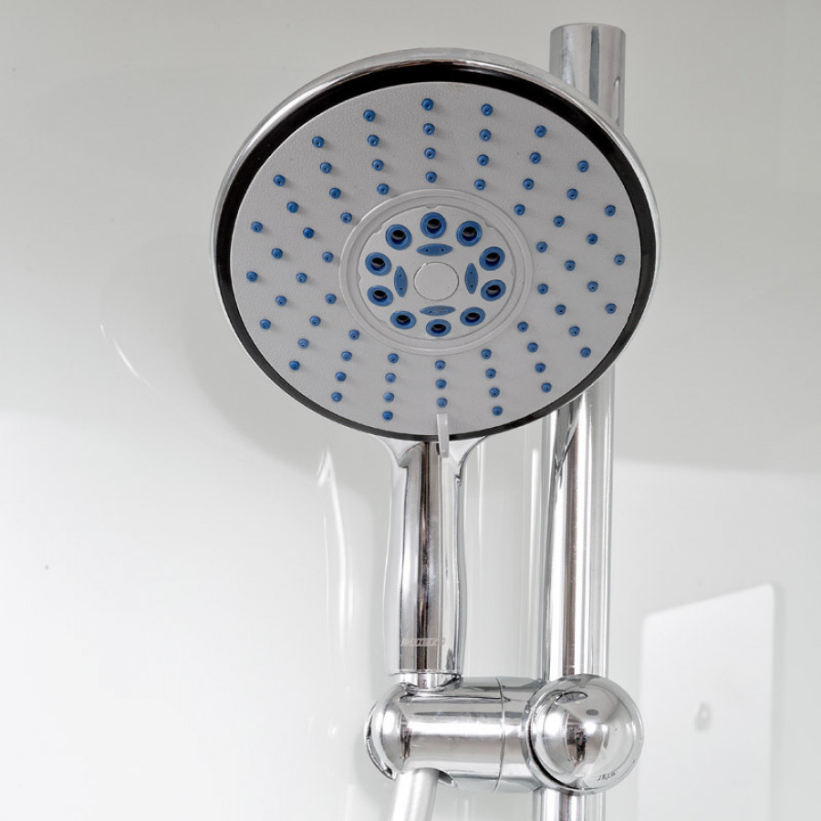 - Душевая штанга с регулировкой лейки по высоте и ручная лейка с силиконовыми форсунками диаметром 140 мм с функцией переключения режимов