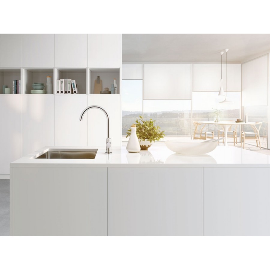 Высокий, поворотный излив значительно увеличивает пространство в зоне раковины. Вы можете выбрать излив, который можно повернуть на 360°, или излив, имеющий ограничение поворота до 30° вправо и влево.