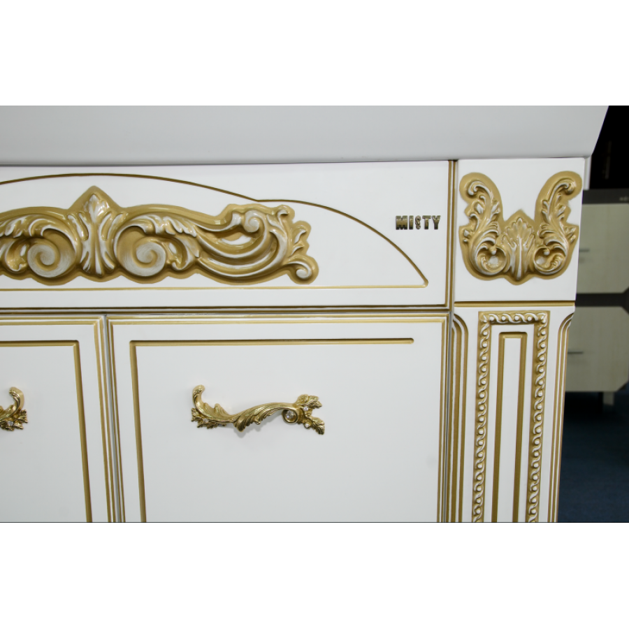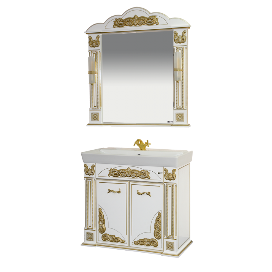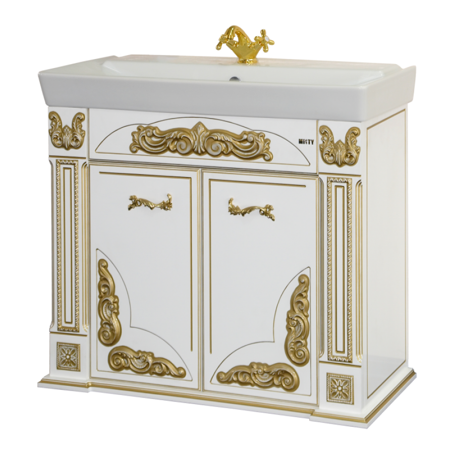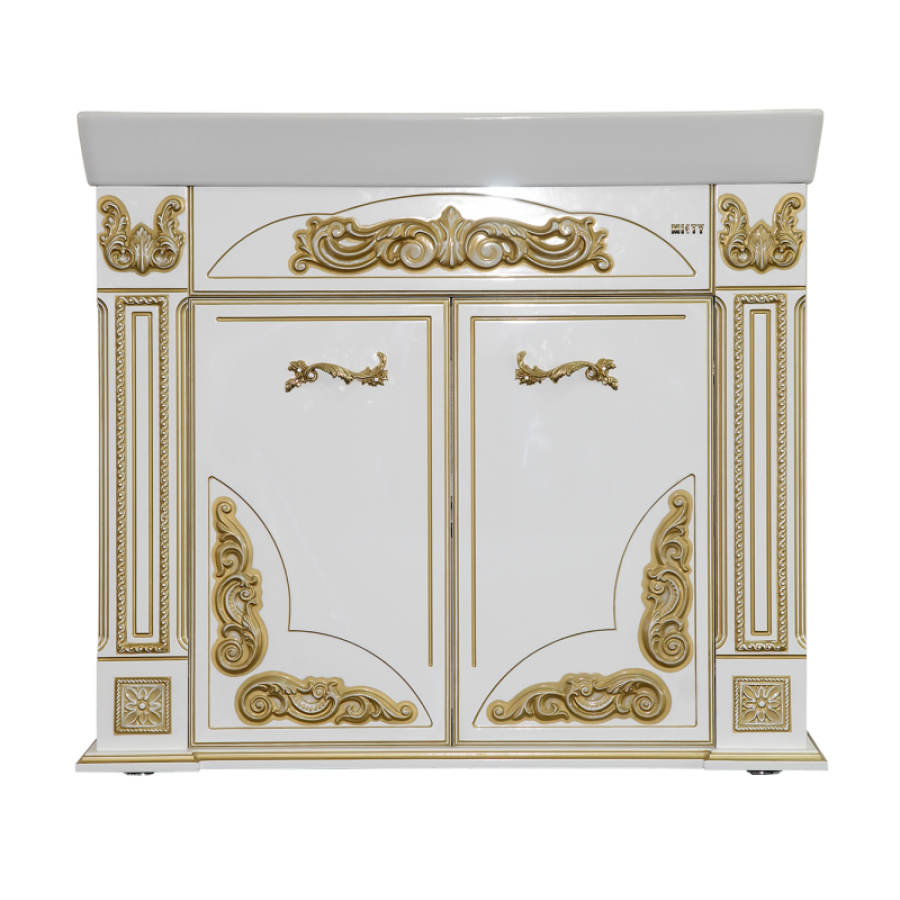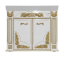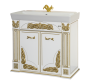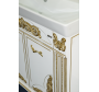 Классический комплект мебели для ванной комнаты Барокко 100 украшен роскошными узорами, выполненными с элементами барочного стиля – с многочисленными завитками и сложным орнаментом, выполненными в белом цвете с оттенком позолоты. Светлая поверхность служит отличным фоном для выразительных узоров. Большая напольная тумба с двумя распашными дверцами, оборудованная роскошной раковиной прямоугольной формы с удобными бортиками и площадками для хранения умывальных принадлежностей.