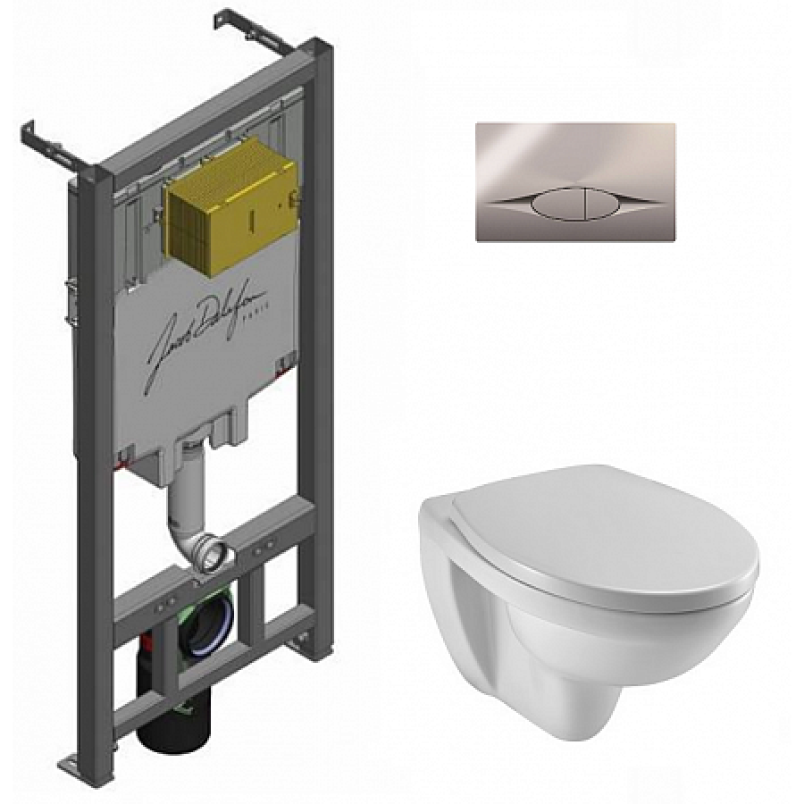 - Комплект Jacob Delafon с инсталляцией E29025-NF кнопка смыва E29027-CP хром и унитазом Patio Rimless EDV102-00 крышка-сиденье E70021-00 с микролифтом