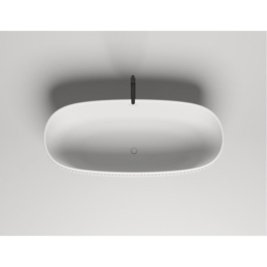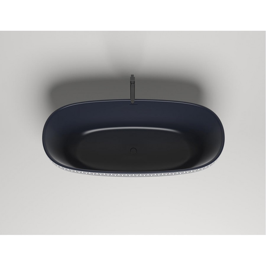 Полоса орнамента из материала S-Stone, прокрашиваемая в глубину любым цветом по палитре RAL интегрирована в борт ванны. Размеры ванны, увеличенная глубина 48 см и интегрированный слив-перелив, расположенный по центру, дают возможность с комфортом принимать ванну вдвоём.