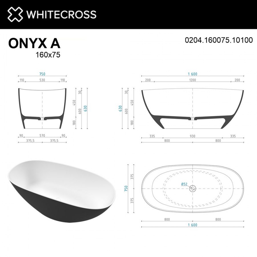 Ванна из искусственного камня Whitecross Onyx A 160x75 черный/белый глянец