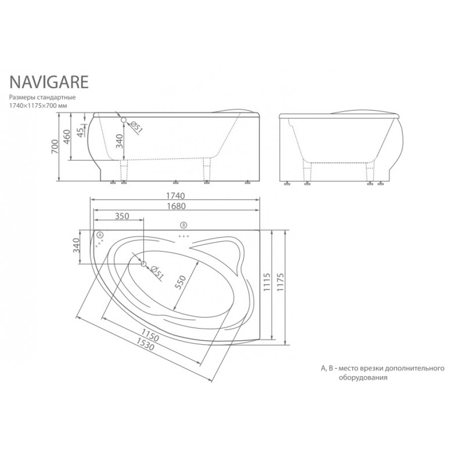 Ванна из литьевого мрамора ESSE Navigare 174x112(118) L/R