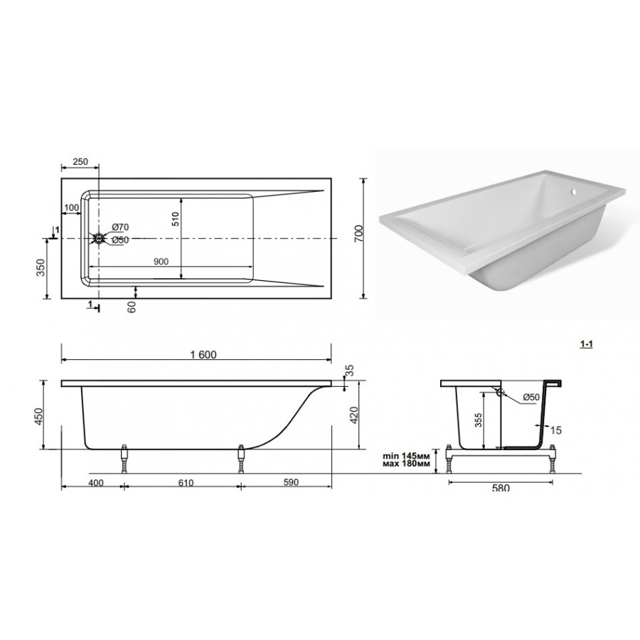 Ванна из литьевого мрамора ЭСТЕТ ДЕЛЬТА 160х70 ФР-00001221